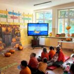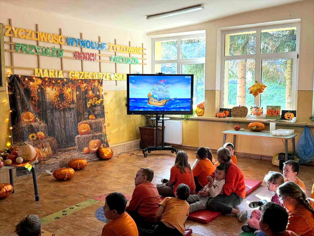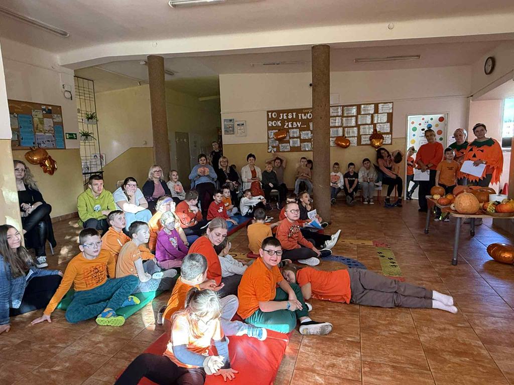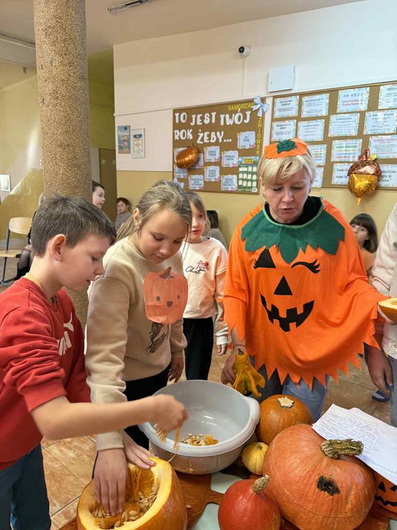 Uroczystość rozpoczęła się powitaniem wszystkich uczestników oraz recytacją wiersza o dyni, który wprowadził dzieci w jesienny nastrój i przypomniał, jak wyjątkowe to warzywo. Następnie uczniowie odpowiadali na zagadkami o warzywach – nie zabrakło śmiechu i wspólnego myślenia. Dzieci z zapałem odpowiadały na pytania, a za każdą prawidłową odpowiedź otrzymywały słodką nagrodę w postaci cukierków. Kolejnym punktem programu był krótki, ale ciekawy film o dyni, z którego wszyscy dowiedzieliśmy się wielu interesujących informacji – o jej pochodzeniu, odmianach i wartości odżywczej. Potem przyszedł czas na wyjątkowe doświadczenie: prawdziwa dynia wędrowała z rąk do rąk, dzięki czemu każdy mógł ją dotknąć, powąchać i obejrzeć. Dużo emocji wzbudziło wydrążanie dyni – uczniowie z ogromnym zainteresowaniem odkrywali, co znajduje się w jej środku. Z zaciekawieniem oglądali pestki i miąższ, poznając tajemnice tego jesiennego warzywa.