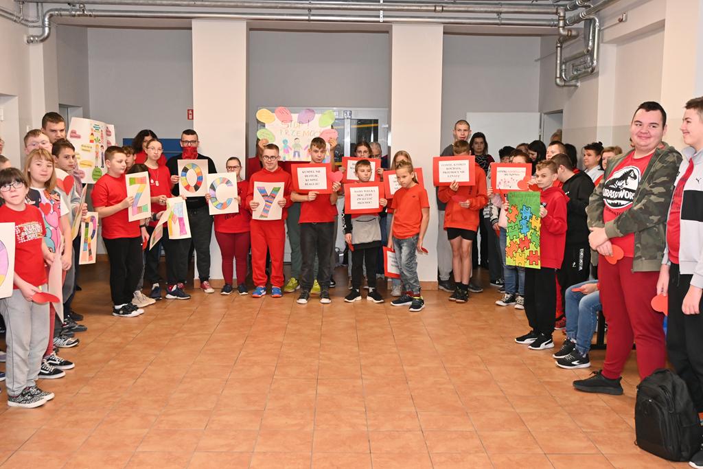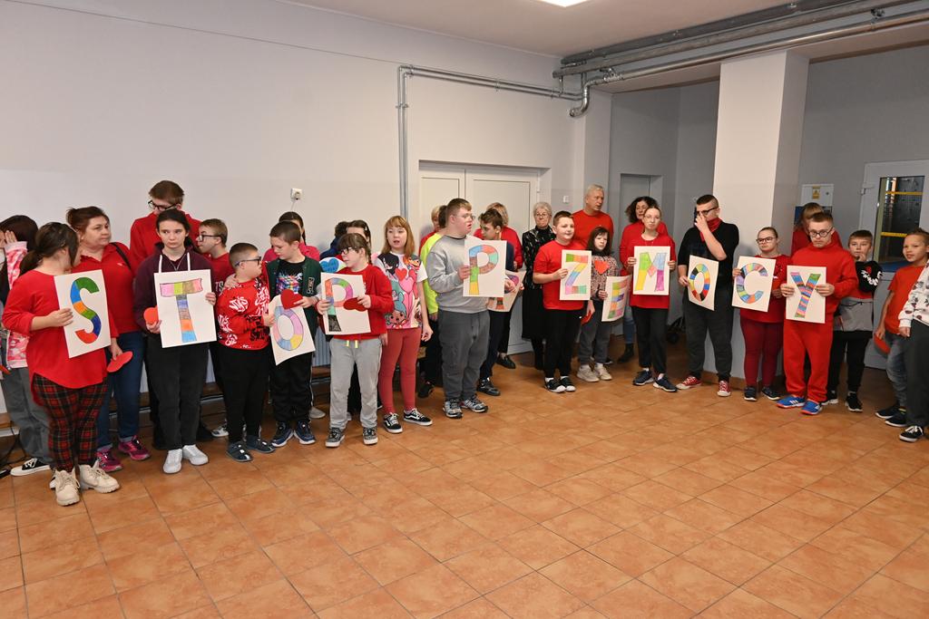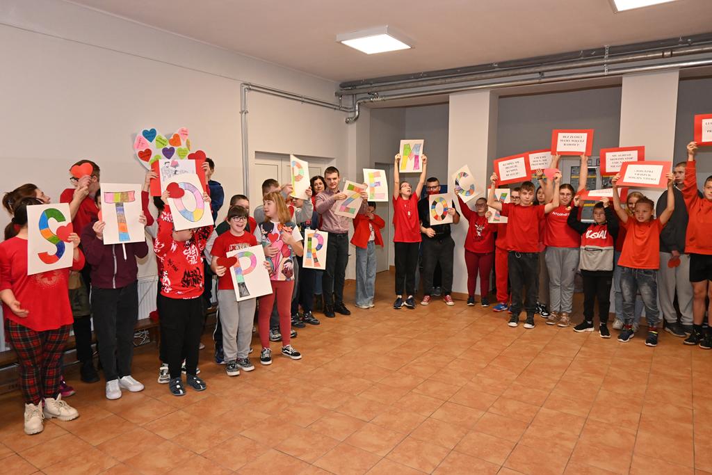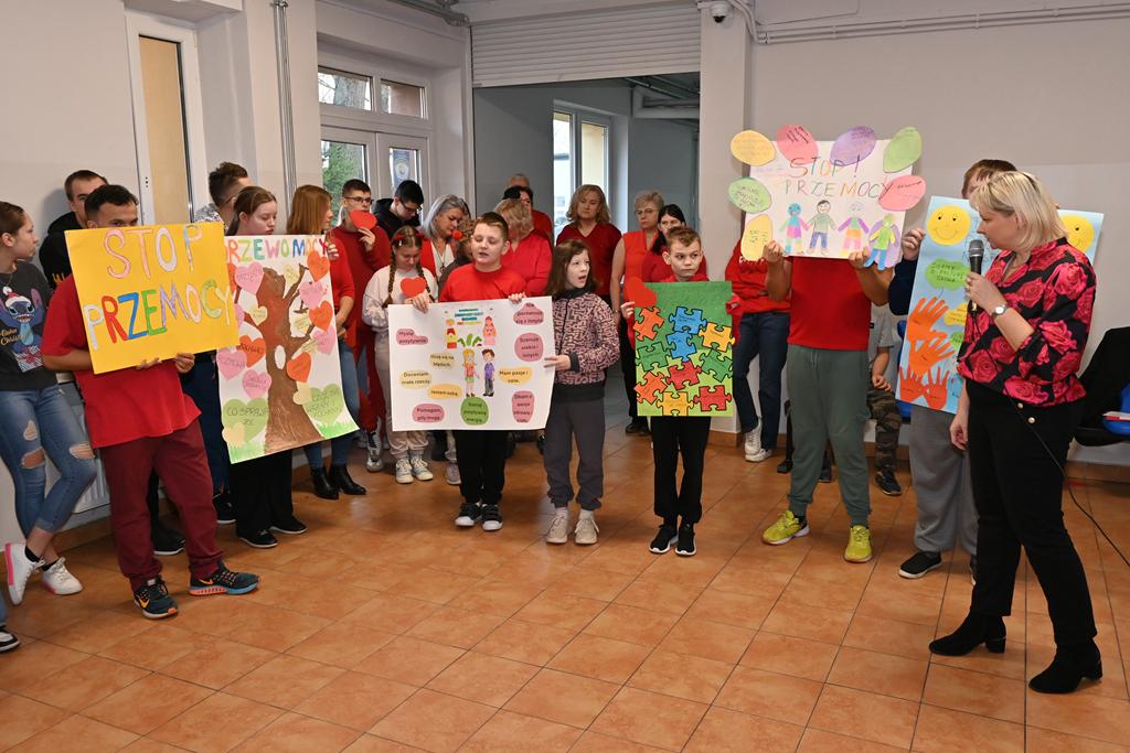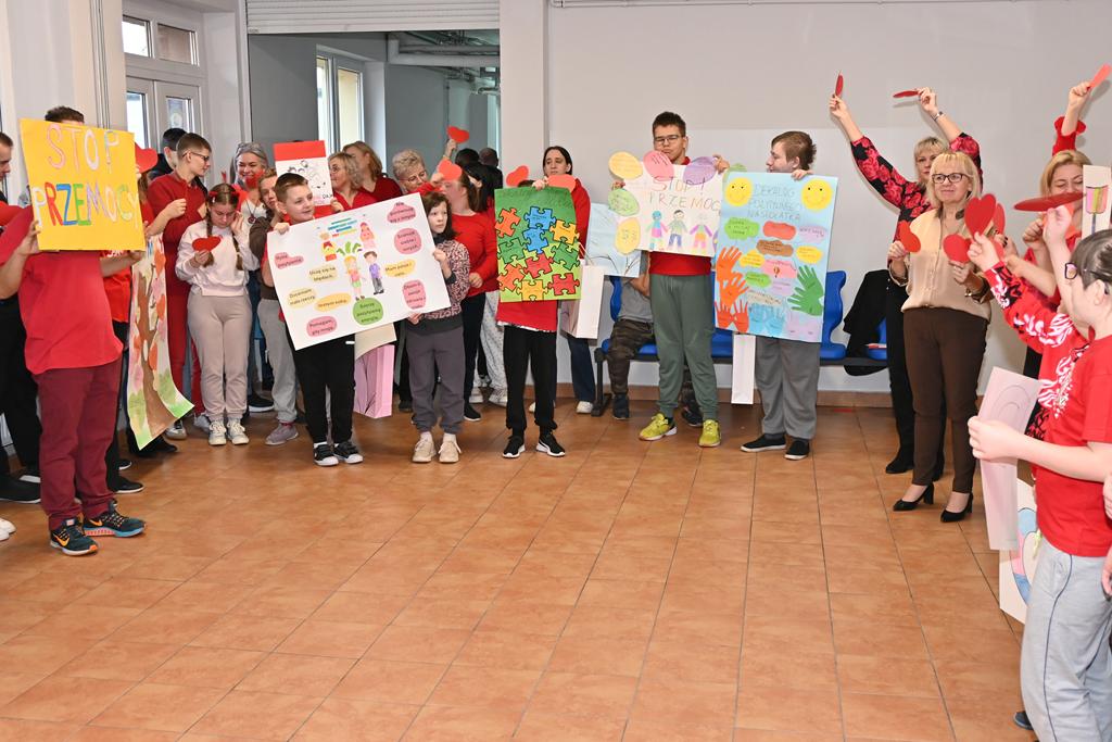 W dniu 19.11.2025r. w ramach ogólnopolskiej kampanii „Dzieciństwo bez przemocy” uczniowie naszej szkoły wzięli udział w happeningu o charakterze profilaktycznym, którego celem było przeciwdziałanie przemocy wobec dzieci. Aby mocniej zaakcentować ten dzień uczniowie i nauczyciele ubrani byli w kolorze czerwonym bądź posiadali czerwone serduszka. Na początku Pani dyrektor Magdalena Kowalczyk skierowała swoje słowa do wszystkich dzieci chcąc przestrzec przed różnego rodzaju przemocą. Następnie odbyła się prezentacja haseł i plakatów przygotowanych przez uczniów ze szczególnym zwróceniem uwagi na ważny temat zapobiegania przemocy wobec dzieci. Odbyło się również podsumowanie profilaktycznego konkursu plastycznego pt. „Dekalog pozytywnego nastolatka”. Kl. IV al. , kl. IV- VI, kl. VII, kl. VIII otrzymały za udział w konkursie pamiątkowe dyplomy i nagrody. Spotkanie zakończono wysłuchaniem i śpiewaniem piosenki „Przemocy mówimy STOP”.